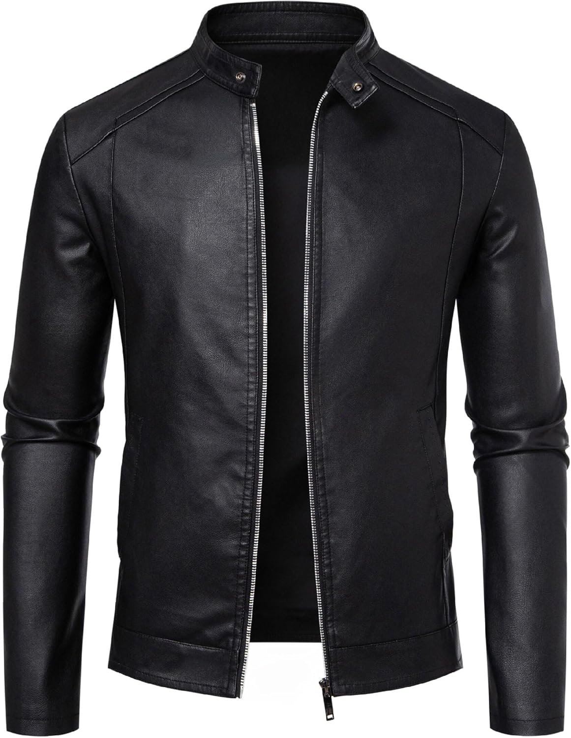 Leather Jackets for Men Faux Leather Stand Collar Motorcycle Bomber Jacket