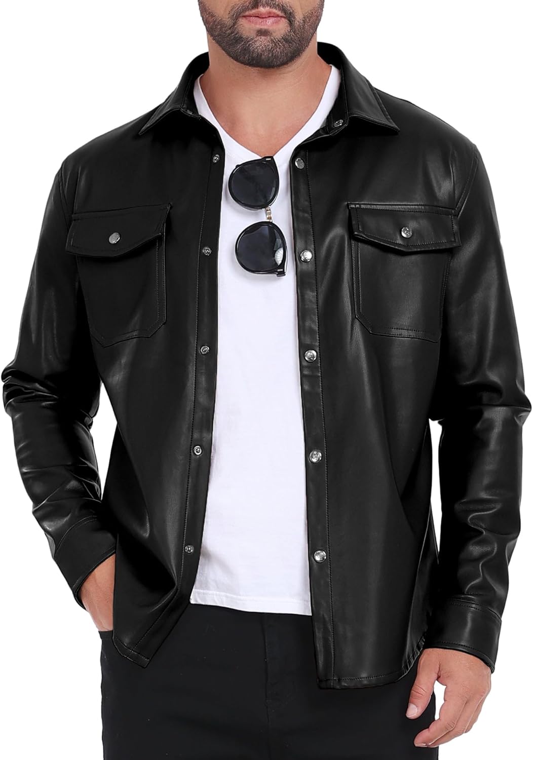 Men’s Faux Leather Jacket, Slim Fit Stretch Classic Windbreak Jacket Lapel Collar Button Down Microfleece